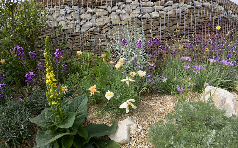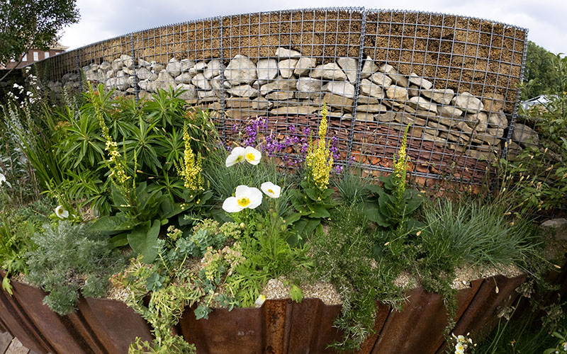 The light, fresh and sandy palette for the garden is reminiscent of north Norfolk’s salt marsh landscapes, with naturalistic planting and slowly rising water that makes visitors want to stay longer than planned. Gabions filled with layered materials from flint boulders to dried marsh grasses depict the eroding coastal cliffs, while reclaimed sheet pile steel walling and simple timber platforms represent mankind’s efforts to intervene in nature. But the slow rising water feature has other ideas. It cuts off access to the garden, while the discreet and overplanted exit path makes it hard to find a way out.